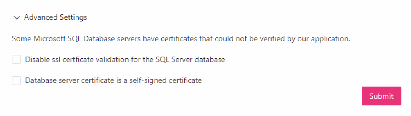 When your SQL Server does not have a valid SSL Certificate you will get an error like `The certificate chain was issued by an authority that is not trusted`. Unfortunately the SQL Server driver is not able to disable the verification on the fly. The solution for this is to close the installer, remove the .app-runtime and app.config.yaml file and start over. This second time, check both advanced settings before submitting.