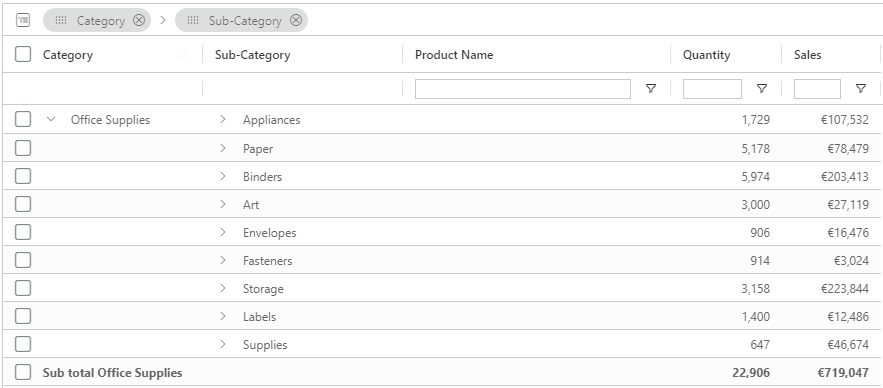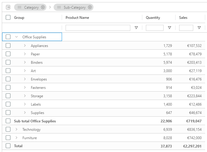 By default, column filters are not applied to cell values shown in Group Rows as they do not usually have any data of their own. However when using Aggregation, group rows will show aggregated values computed based on their child rows. You can filter the grid based on the group row aggregated values by enabling this setting.