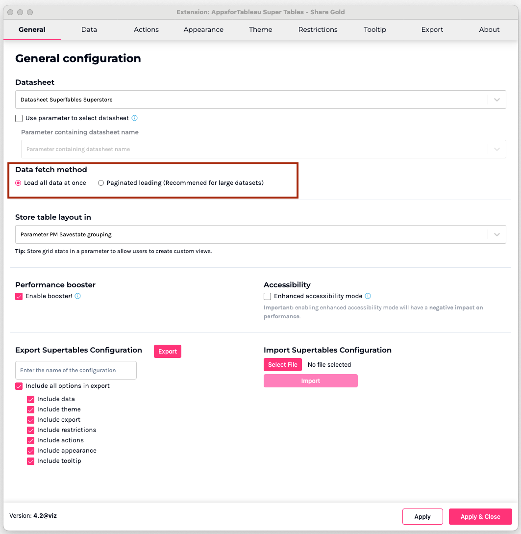 SuperTables offers two ways to fetch your data to the extension, a bulk load all at once or paged loading. The Paged loading option “Loading Screen” requires Tableau version 2024.1 or higher or Tableau Cloud.