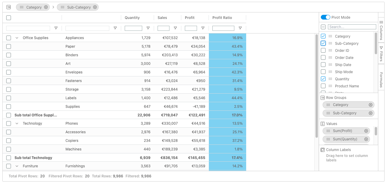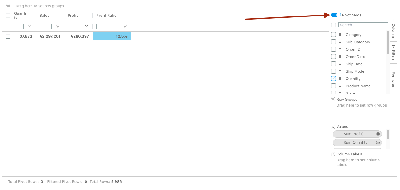 The Pivot Mode can be enabled by opening the side panel and clicking on the Pivot Mode toggle. Your table will now only display the aggregate values of the columns that you had enabled. Try enabling some dimension columns. Enabling the columns will the dynamically aggregate the data based on the data in the column.