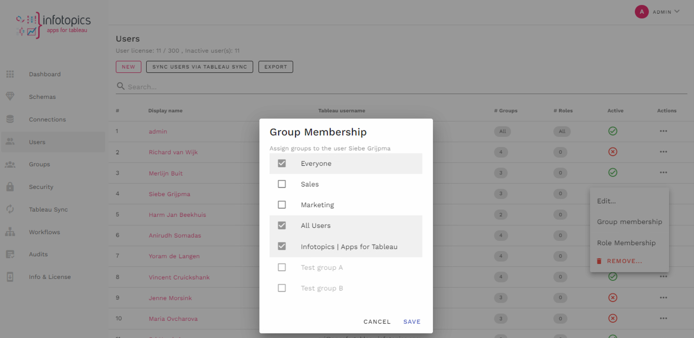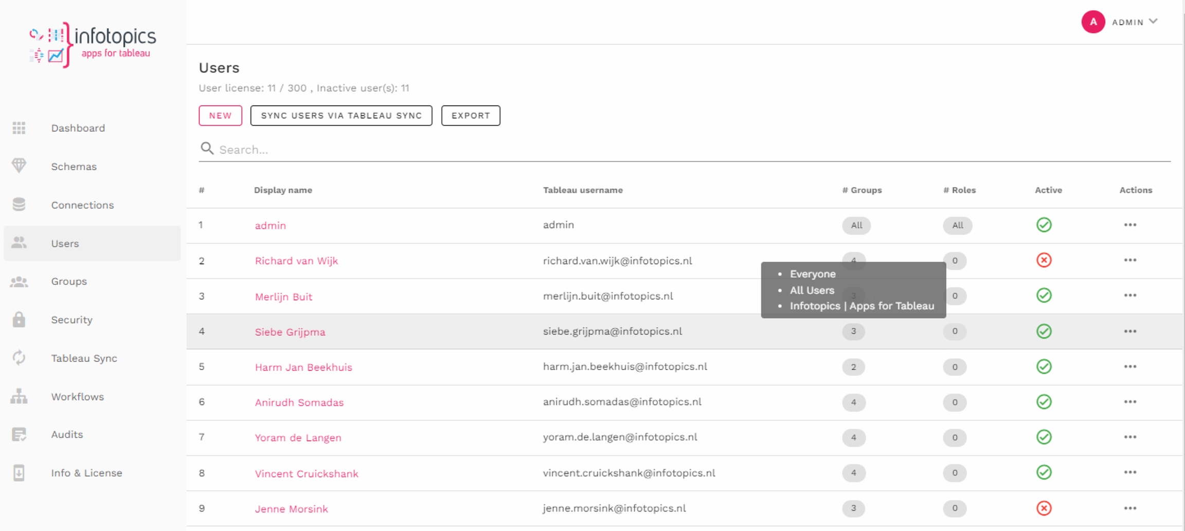 Whenever somebody opens a dashboard with the WriteBackExtreme extension inside, this user will automatically be authenticated and registered as a standard user in the Management Console of the Extension. If the user already exists in the Management Console and has access through a group to the schema, the extension will show. If the user does not exist, they are registered as a standard user and part of the “everyone” group, only being allowed to see schemas attached to this group.