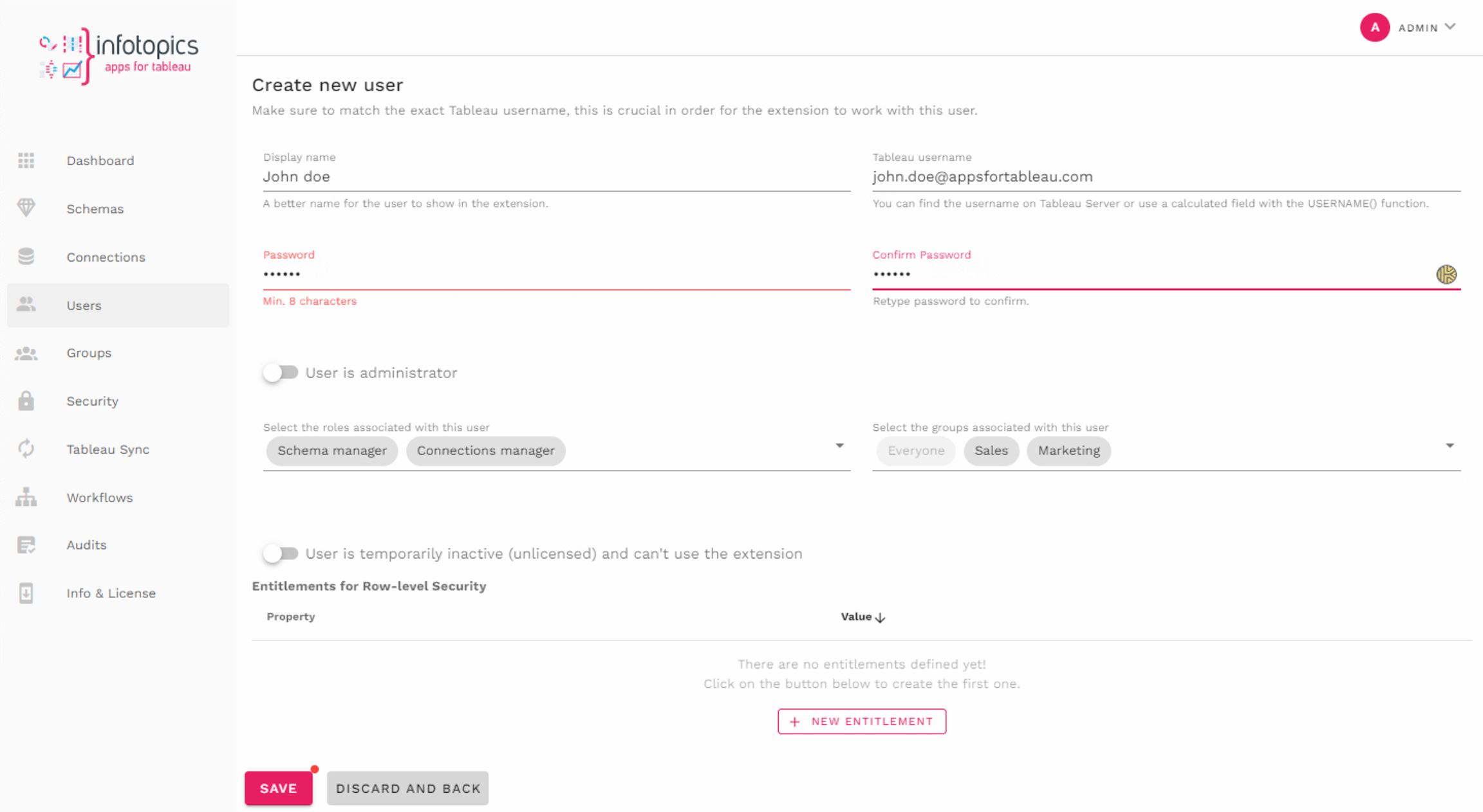 Below you see an animated GIF that illustrates the entire process of creating a new user. You can also edit user properties just by clicking on a user and adjust the properties.