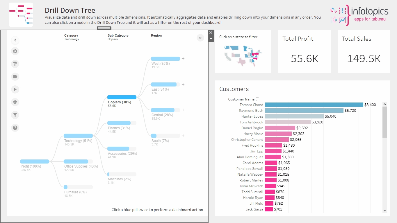 Now you can see real time changes by clicking on any blue pill twice. You may also trigger the DrillDownTree using dashboard actions on any of your other worksheets on your dashboard. Dashboard actions work both ways! Decide what you wish to happen when clearing your selection using the dropdown menu. You may wish to leave the filter in place when deselecting, that can be chosen here.
