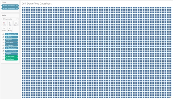 Drop the measure(s) and dimensions onto the detail of your marks card on a separate or new worksheet. This setup allows DrillDownTree to perform at its best and ensures greater flexibility for dashboard actions.