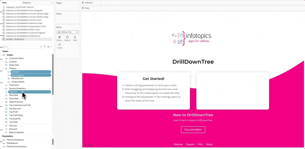 Start dragging and dropping dimensions and measures into the marks card to get started with DrillDownTree.