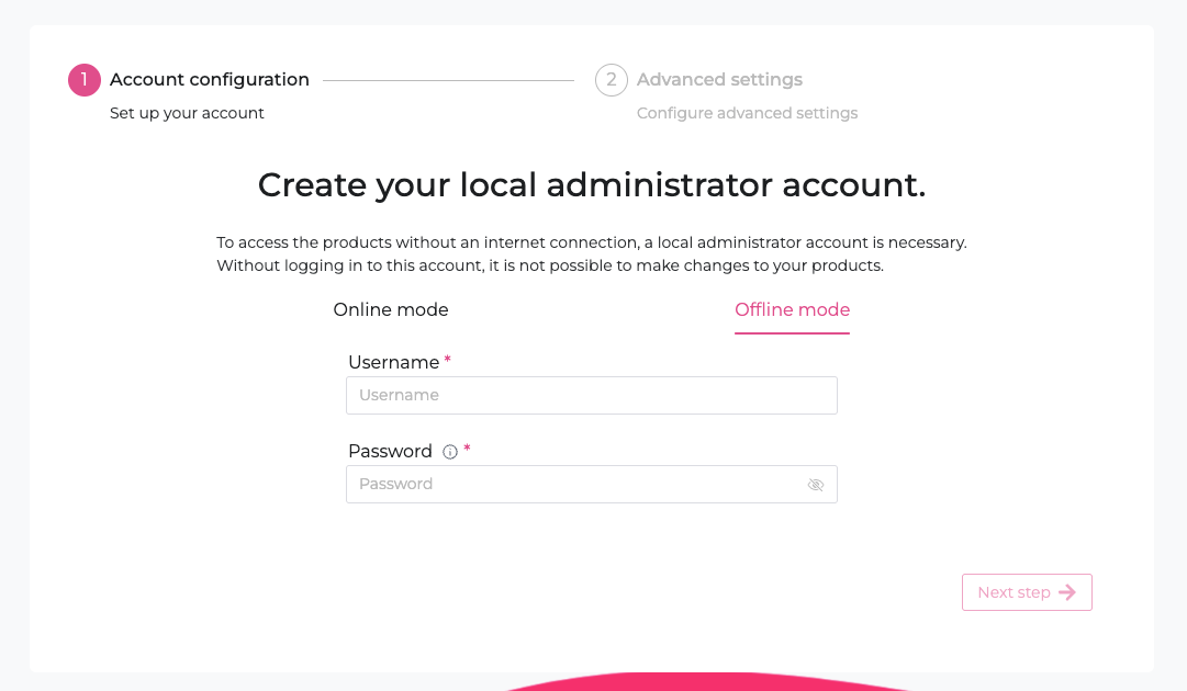 To access the products without an internet connection, an administrator account is necessary. Without logging in to this account, it is not possible to make changes to your products. Store the credentials to this account somewhere securely.&#x20;