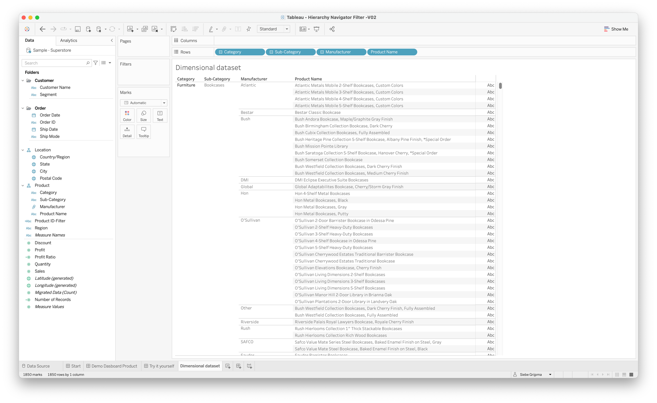 To set up the dashboard extension, you will need to create or use a datasheet with a dimensional data structure. In this example, we use Product structure from the SuperStore dataset which is already available as a hierarchy. The image shows an example of the Product structure hierarchy in the SuperStore dataset, but the dimensions don't have to be in a Tableau Hierarchy structure. The dimensions you want to use for the HierarchyFilter can be put on the rows shelve in any order.