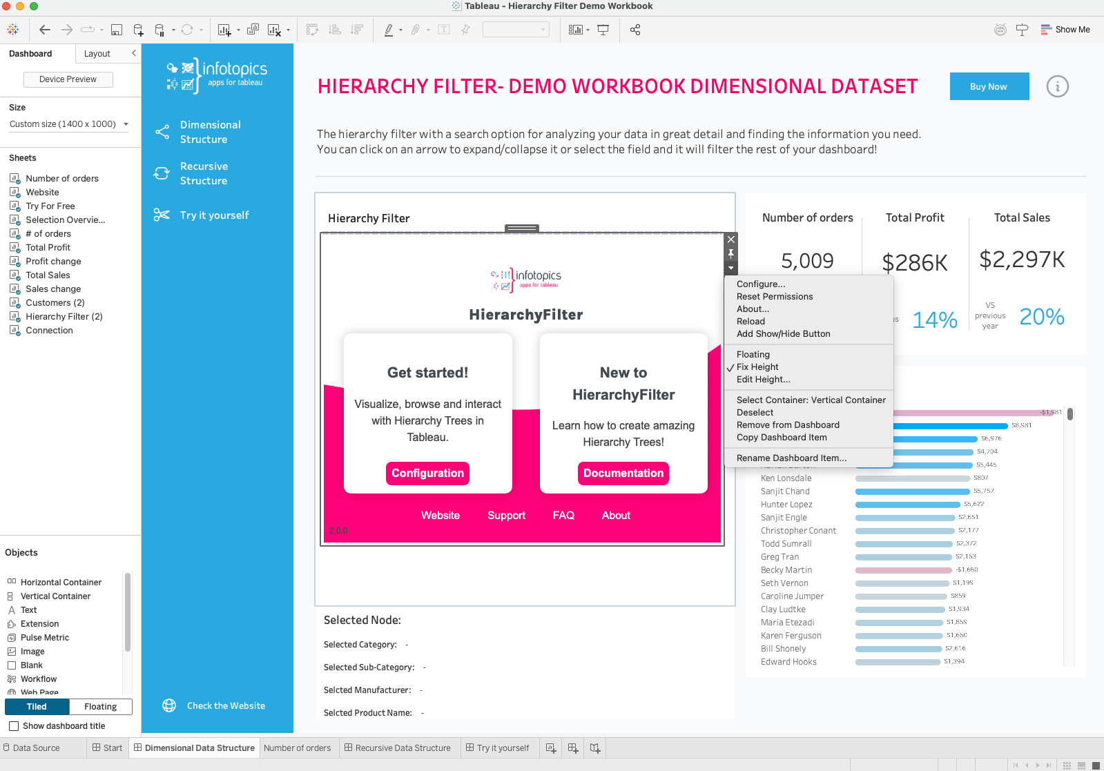 The next step is to create your dashboard with the HierarchyFilter. Create a new dashboard and add your hierarchy datasheet to the dashboard. This sheet contains the data that will feed the HierarchyFilter extension. You can also add some other Tableau visualization sheets to the dashboard based on the same data source. This way you can use the interactivity of the HierarchyFilter extension.