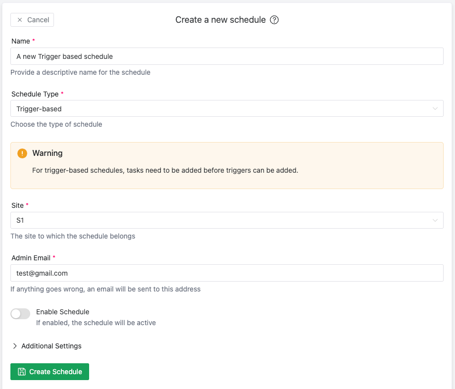 When creating a schedule, you can now opt to create a "Trigger-based" schedule. Select this option, and then press the 'Create Schedule' button.