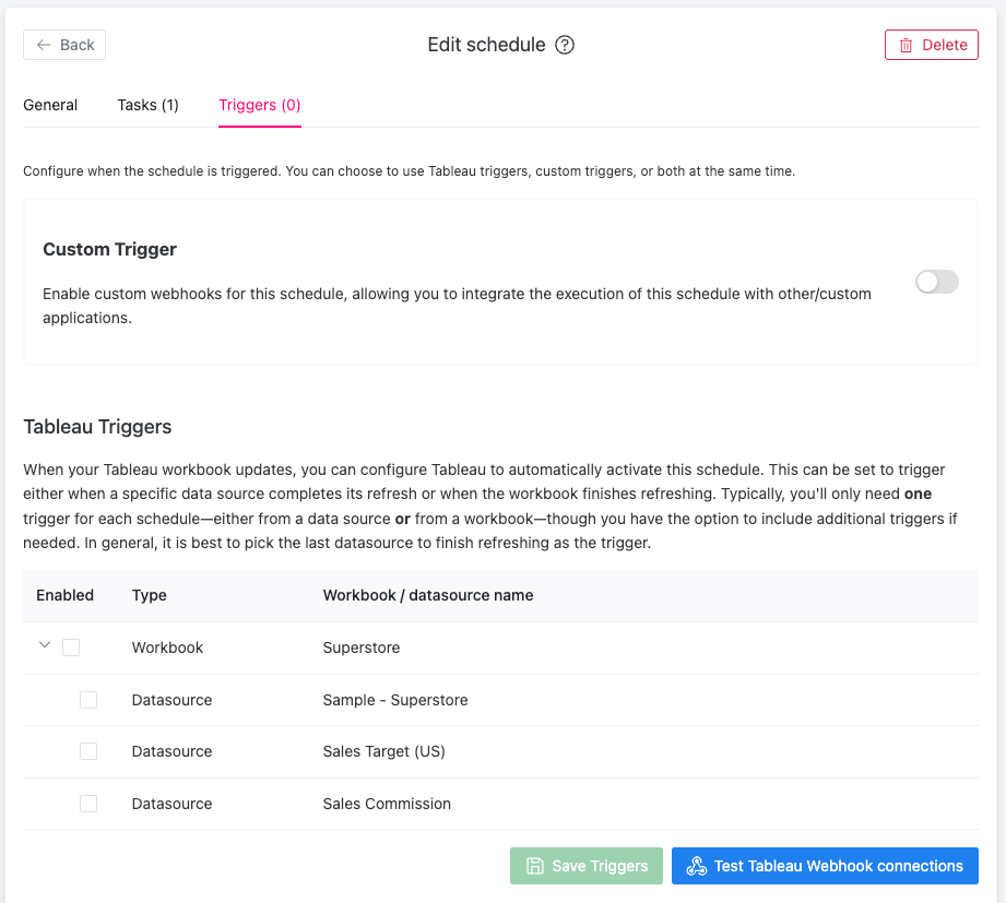 When you have selected how you want the schedule to be triggered, you can press the 'Save Triggers' button. Afterwards, you can press the 'Test Tableau Webhook connections' button to test if the connection from Tableau to your server is successful.