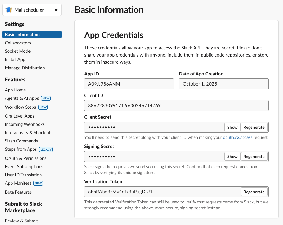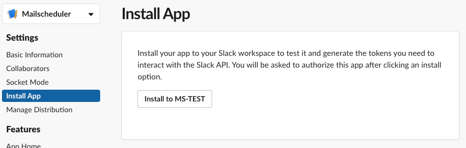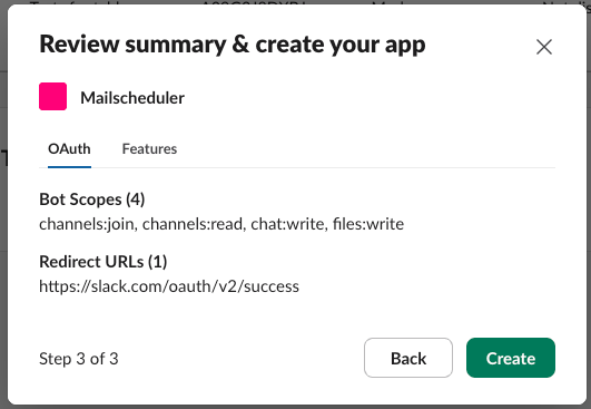 To start using Slack with MailScheduler, you will need to create your own 'Slack App', which we will build off of a Manifest which you can copy from the MailScheduler application.