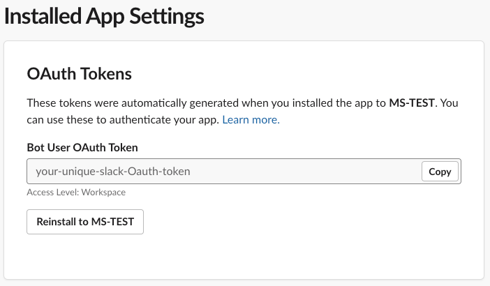 Press the 'Install to ...' button, then follow the installation steps. When you are done, you will be presented with your Bot OAuth token: