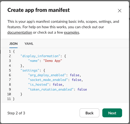 Here, you can simply press the 'Copy Manifest' button in the top right, then, go back to the slack app, and paste it back in:
