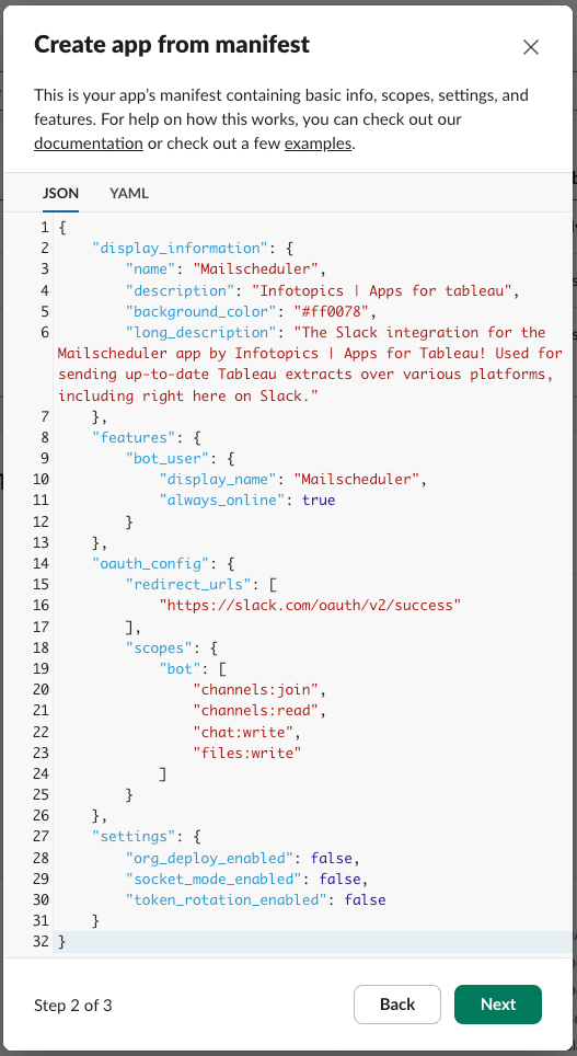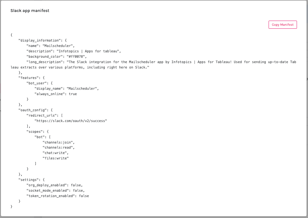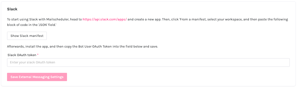 To find the manifest in MailScheduler, head to the Settings, then click the External messaging tab, and then press the 'Show Slack manifest' button.