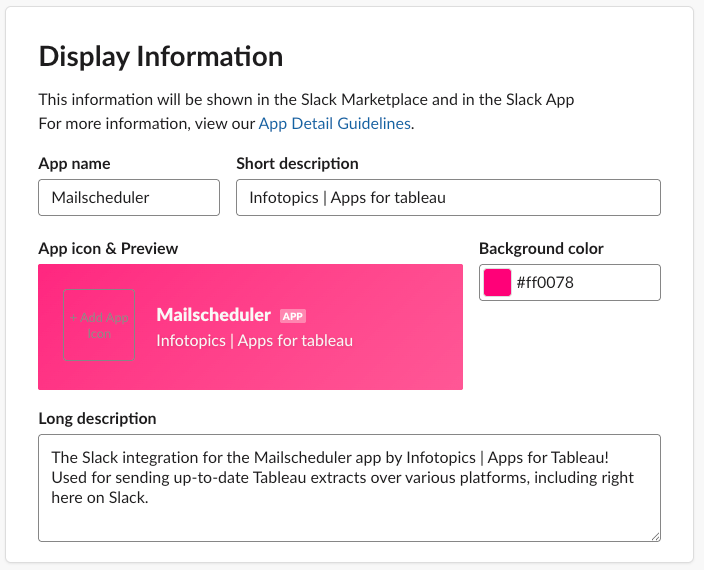 Scroll down, and you will reach the 'Display Information section'. Click on the 'Add App Icon' button in the square. Now you can download the MailScheduler Logo, and upload it to serve as the App Icon.