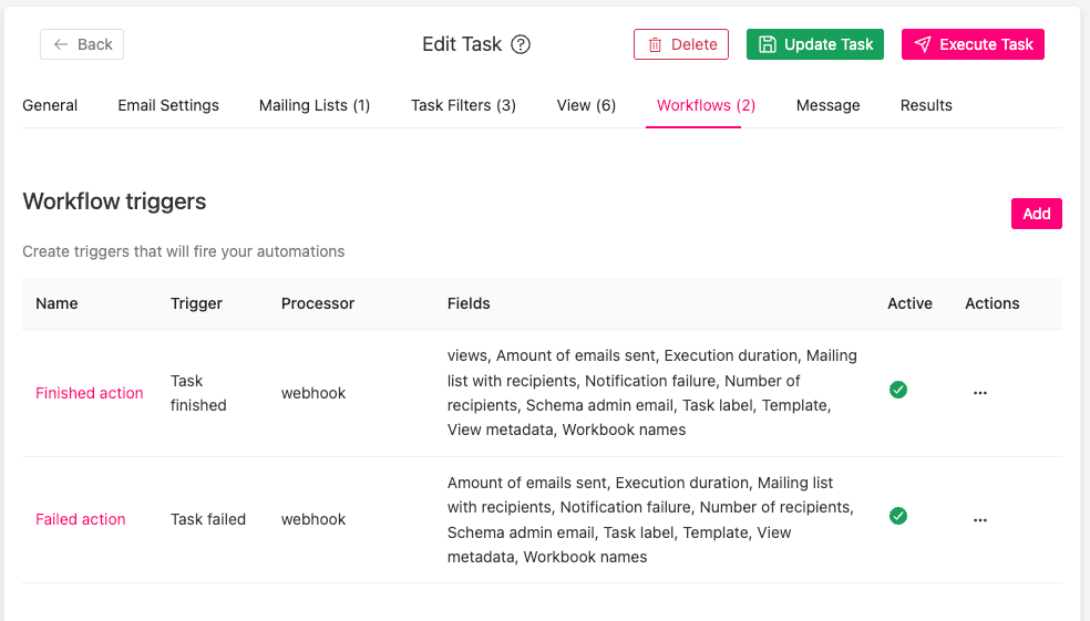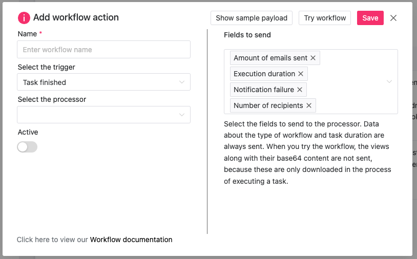When you add a workflow action, you can choose a name for the action, the type of trigger, what processor you want to send the data to, and then on the right the fields to send when the workflow action is executed. To test the workflow, press the 'Try workflow' action. Keep in mind that no views data will be sent during testing, even if it is enabled. This is because the views are downloaded as part of the task execution. During normal execution, the views data will be sent.