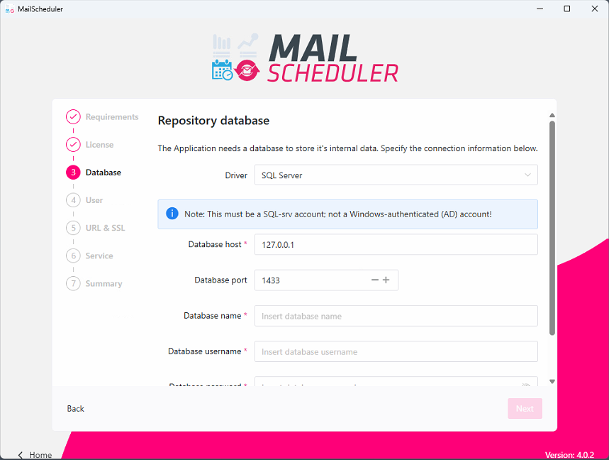 To use SQL Server, an SQL-srv account has to be used as opposed to a Windows-authenticated (AD) account. Furthermore, the following is required:
