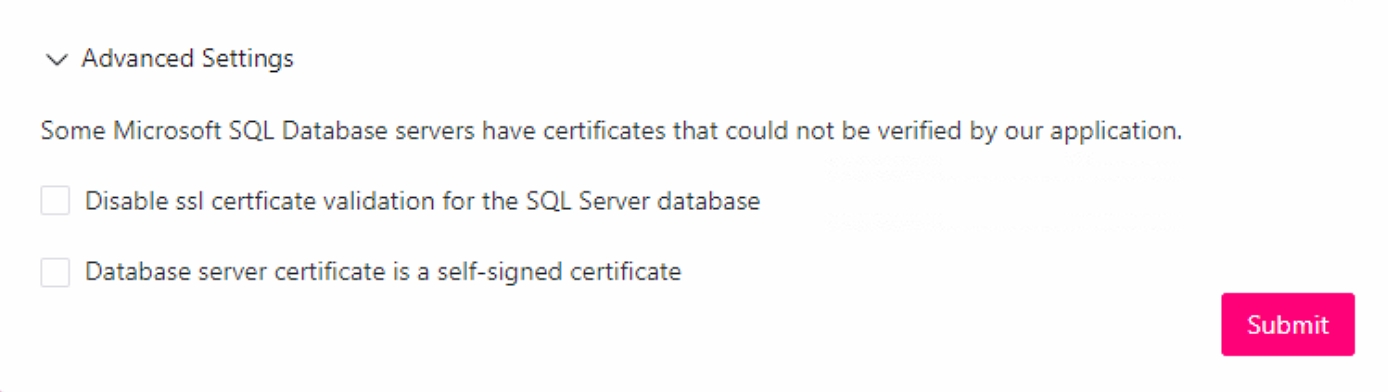 When your SQL Server does not have a valid SSL Certificate you will get an error like `The certificate chain was issued by an authority that is not trusted`. Unfortunately the SQL Server driver is not able to disable the verification on the fly. The solution for this is to close the installer, remove the .app-runtime and app.config.yaml file and start over. This second time, check both advanced settings before submitting.