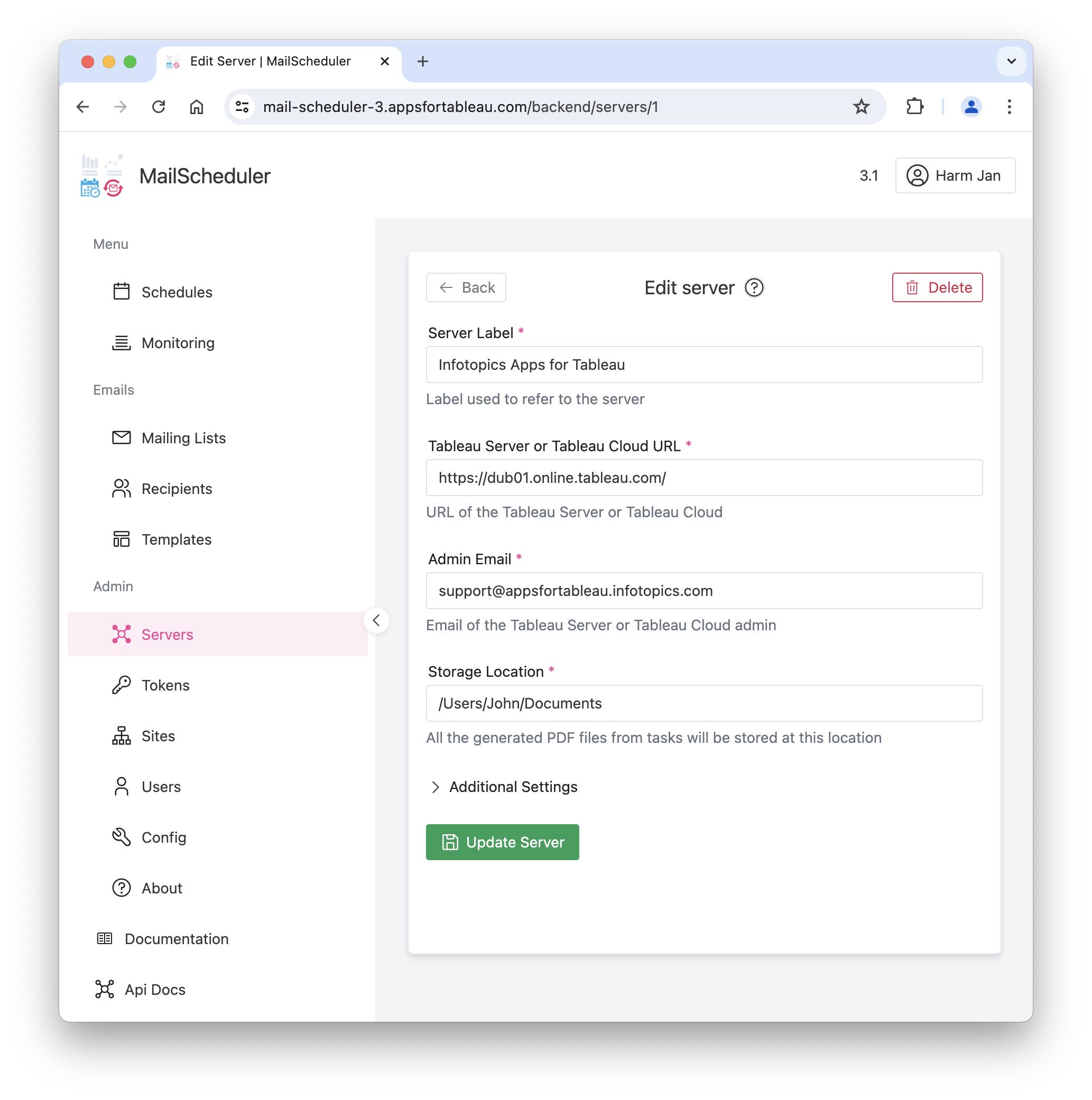 Servers are the Tableau Server or Tableau Cloud environment on which the dashboard are hosted. Certain configurations might need to be aligned between MailScheduler and Tableau, such as the CSV delimiter (see additional settings).
