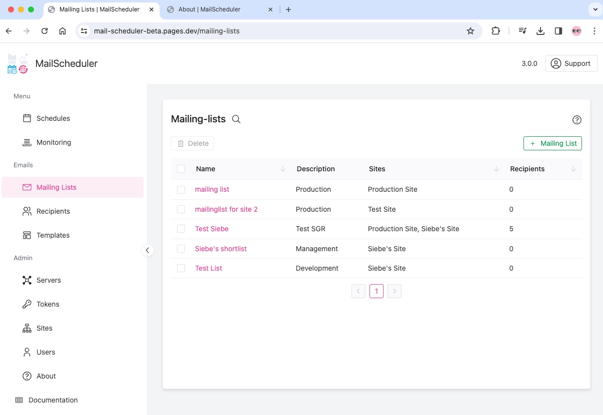 The mailing list has a name and description. Creating a new mailinglist involves selecting which sites will be required. Upon creation, recipients can be added to the Mailinglist.