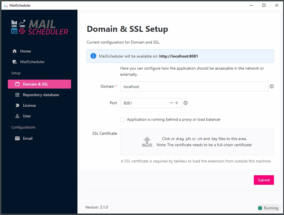 On this page it is possible to (re)configure the domain, proxy and SSL certificates for the MailScheduler service.