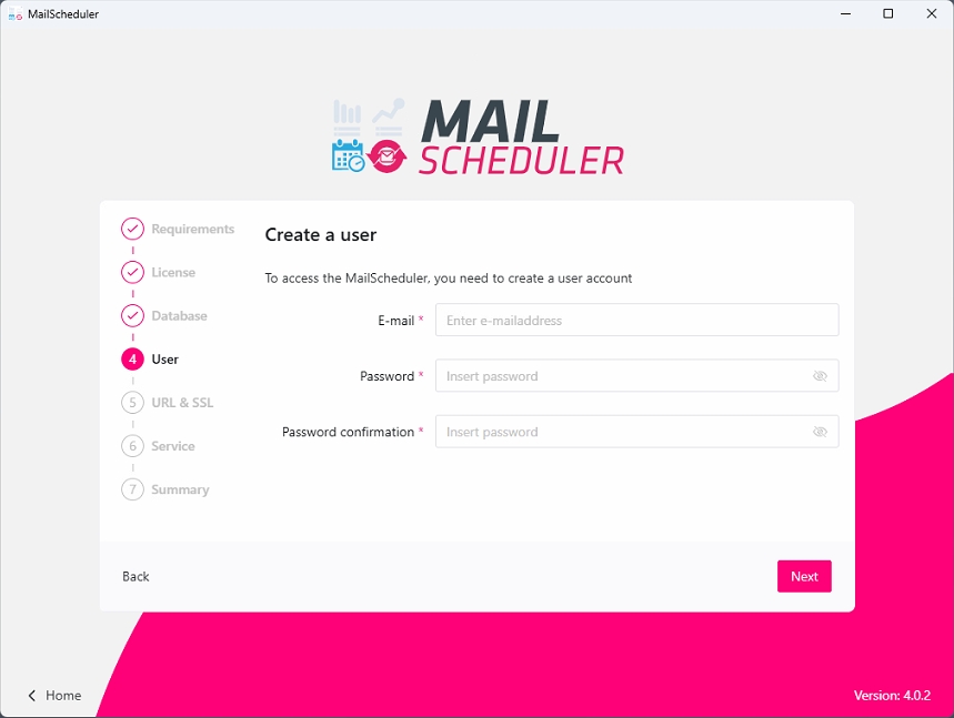 The next step is to create an admin user for the backend of MailScheduler. This user will be used for the initial login into the backend. Make sure to write down or remember the login information (this can be changed in the backend after logging in).