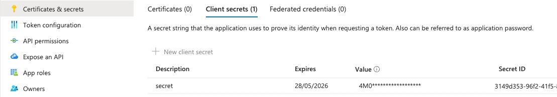 Navigate to 'Certificates & secrets'. Under the secrets header, make a new client secret, and copy the client secret value into correct field in Mailscheduler.