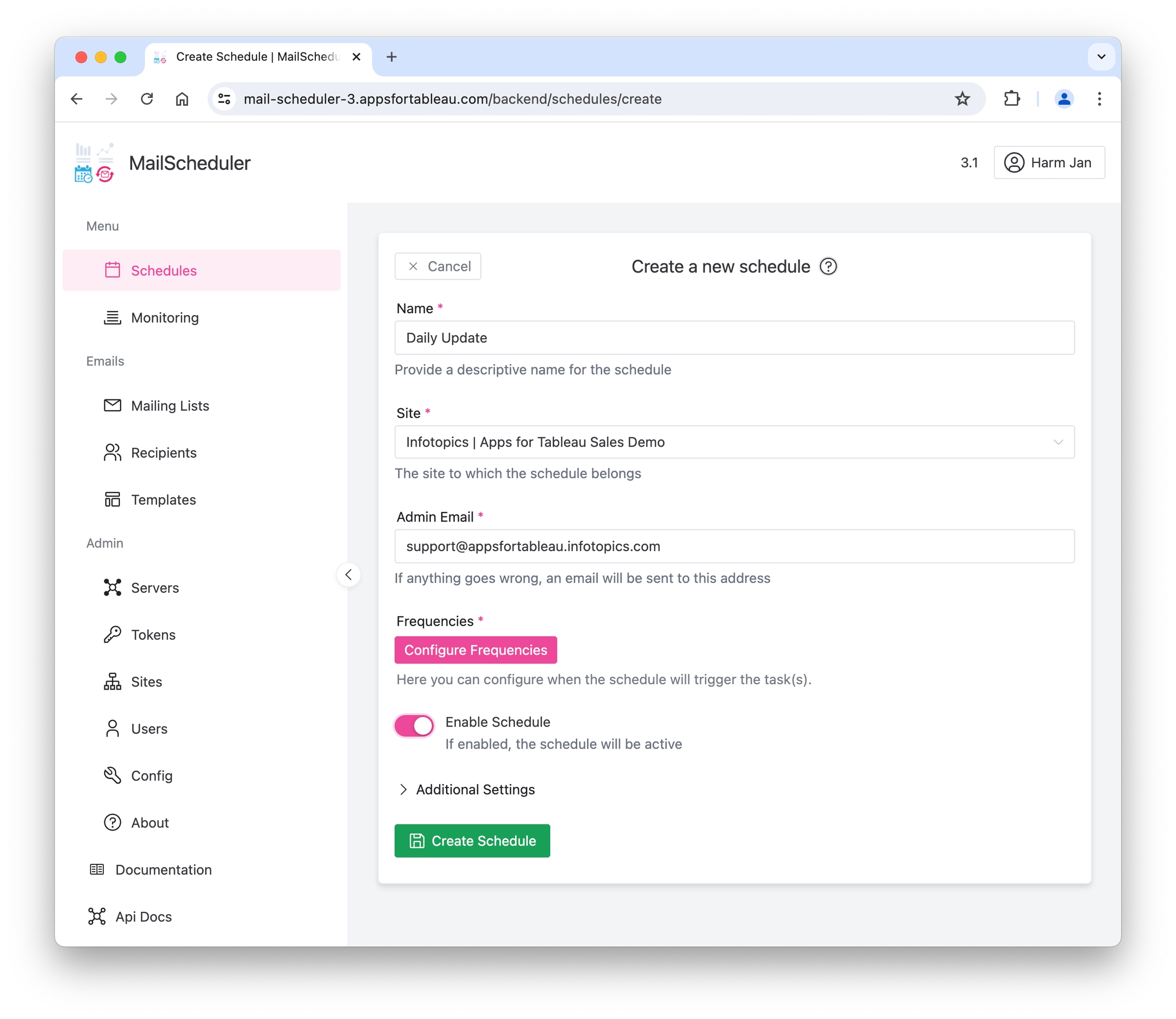 Adding Tasks can only be done after the Schedule has been created and saved. In the Schedule overview, navigate to the newly created Schedule to add Tasks.