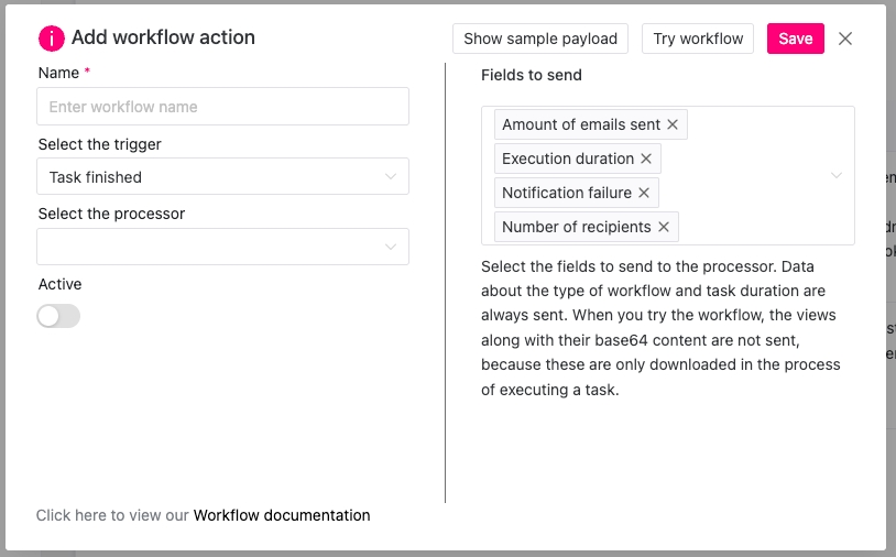 When you add a workflow action, you can choose a name for the action, the type of trigger, what processor you want to send the data to, and then on the right the fields to send when the workflow action is executed. To test the workflow, press the 'Try workflow' action. Keep in mind that no views data will be sent during testing, even if it is enabled. This is because the views are downloaded as part of the task execution. During normal execution, the views data will be sent.