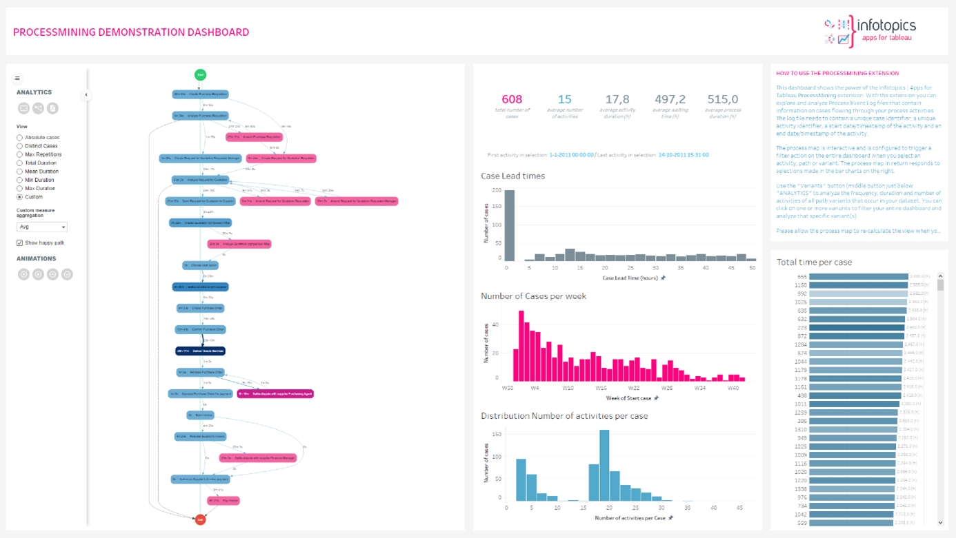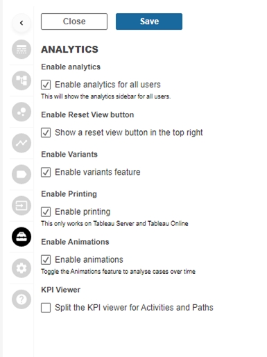 In the analytics tab you will have full control of what analytics options are shown with your process mining interface for dashboard users. Enable and disable analytics, variants, printing and animations etc.