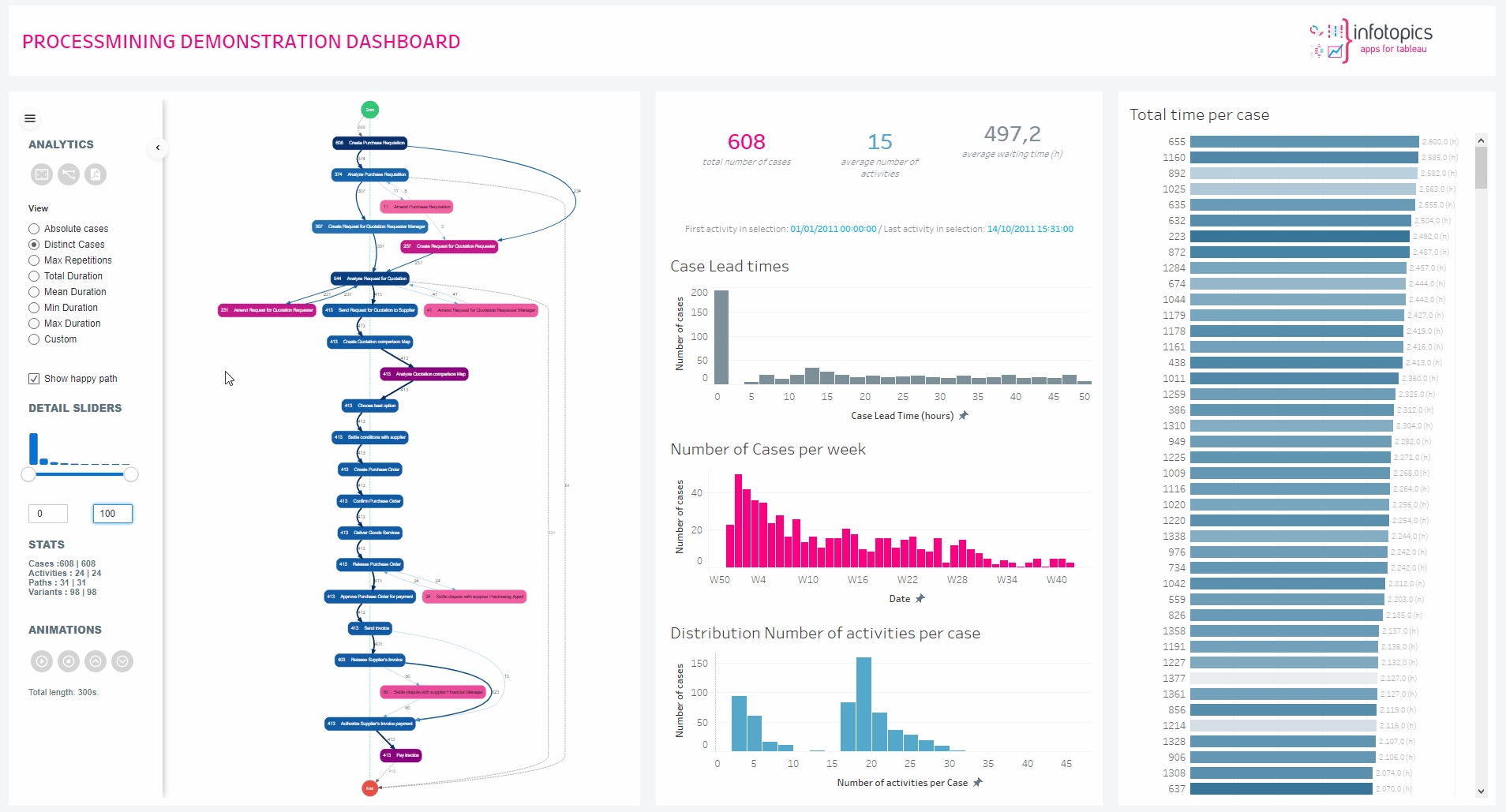 While moving the detail slider, if the nodes configured in the happy path is not available in the filtered path, then the nodes in the happy path will change color to grey without any value associated to it. In this way it is easy to analyze the process map and check if certain process skip important steps or following the structure.