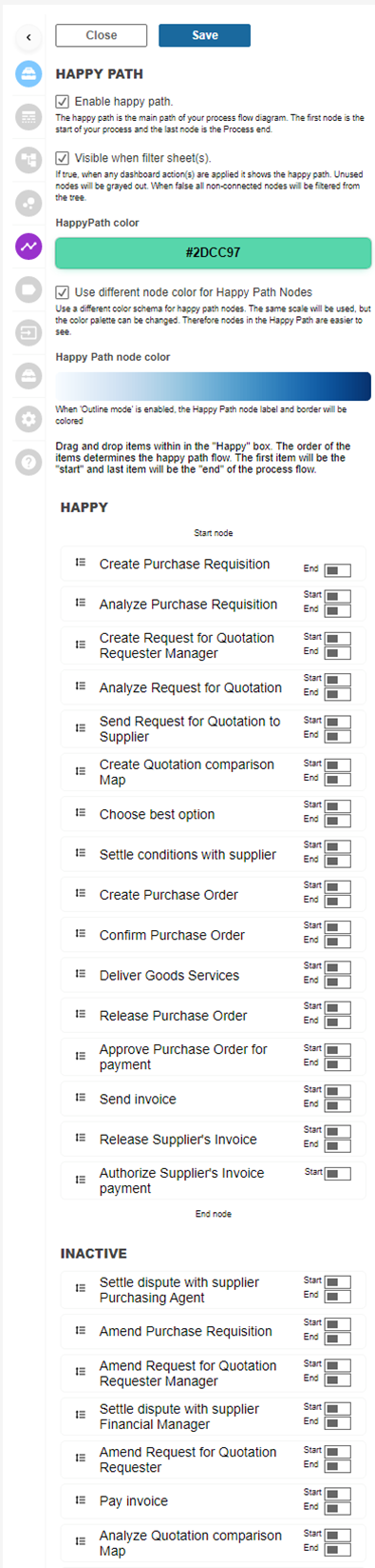 Hit “Enable happy path” to have the opportunity to show the Happy Path in your Process Map. Click the ‘Visible when filter sheet(s)’ this will show the activities of the Happy Path in the visualisation even when your filtered data does not contain the Happy Path activities. The unused “Happy Path” nodes will be greyed out but still be visible. When false all non-connected nodes will be filtered from the tree.