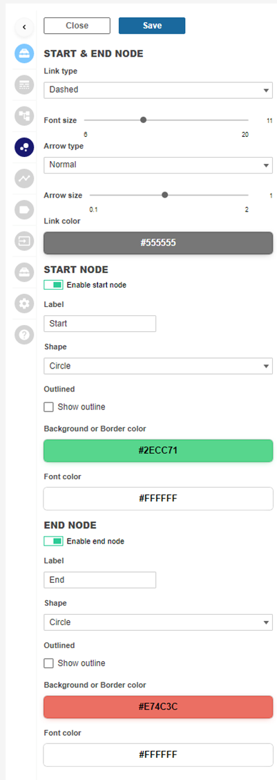 The configuration menu speaks for it self. You can enable/disable the StartEnd nodes, set line styles, coloring and labels. It is up to you if and how you visualize these nodes on your Process canvas.