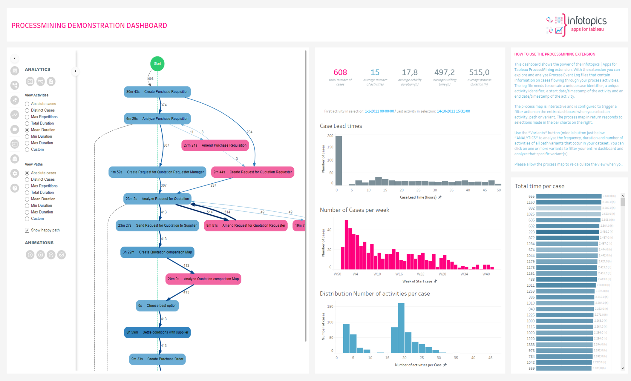 The ProcessMining extension supports animations of cases flowing through your process (End Date/Timestamp is required). This option enables or disables the option to play animations for dashboard users.
