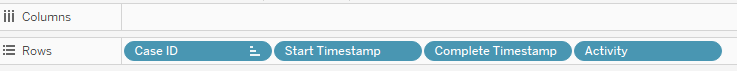 Make sure you do a nested sort of your Case ID (and the next dimensions) on the minimum of the “Start” Date/Timestamp. This will make sure that your activities are sorted in a chronological way. The content of the ‘datasheet’ should look something like the screenshot below: