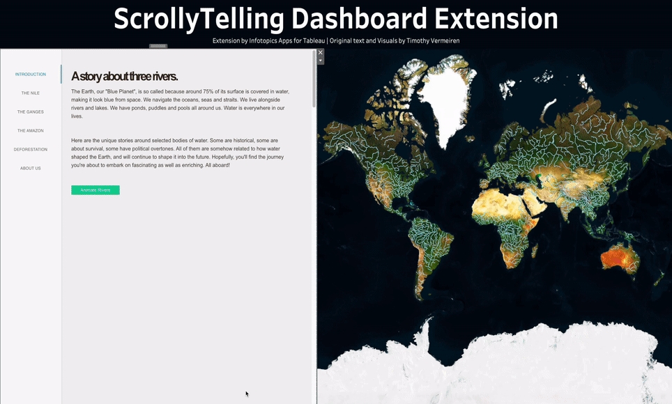 That’s why we bring you an easy-to-use and powerful way of communicating with your dashboard users, ScrollyTelling. ScrollyTelling lets you change the way the dashboard user interacts with a dashboard. Imagine a new way of data-driven stories in your dashboard, where the story changes the look and feel of the dashboard as you progress. It lets you show the appropriate Tableau vizzes/illustrations where you want them to show up in your story. Allow animations in your dashboards and use the set of filters, parameters and highlights to create stunning stories with impact. All without ever leaving the dashboard.