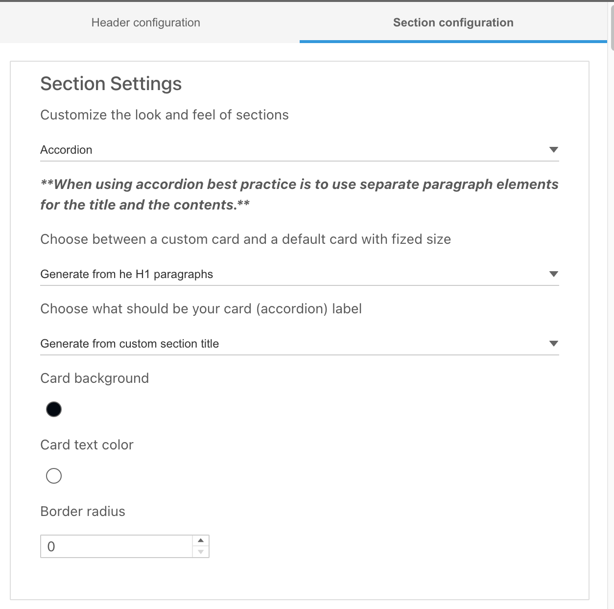 Choosing the custom card you’ll be presented with extra options to choose the text size and card size. With the default configuration (generate from H1) the accordion text will be generated from section titles with H1 tag.