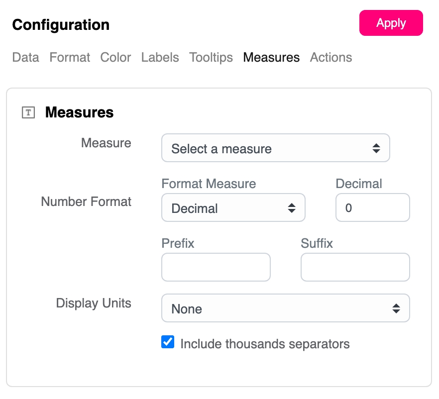 You can format your measure as a decimal or a percentage using the dropdown menu. Input the number of decimal spaces in the 'Decimals' box. You can also add a 'Prefix' and/or a 'Suffix' in the text boxes. The prefix will appear before the word, while the suffix will appear after. For example, a prefix could add a currency symbol like '$' and a suffix could add a percentage symbol '%'. You can also choose to include the thousands separators.