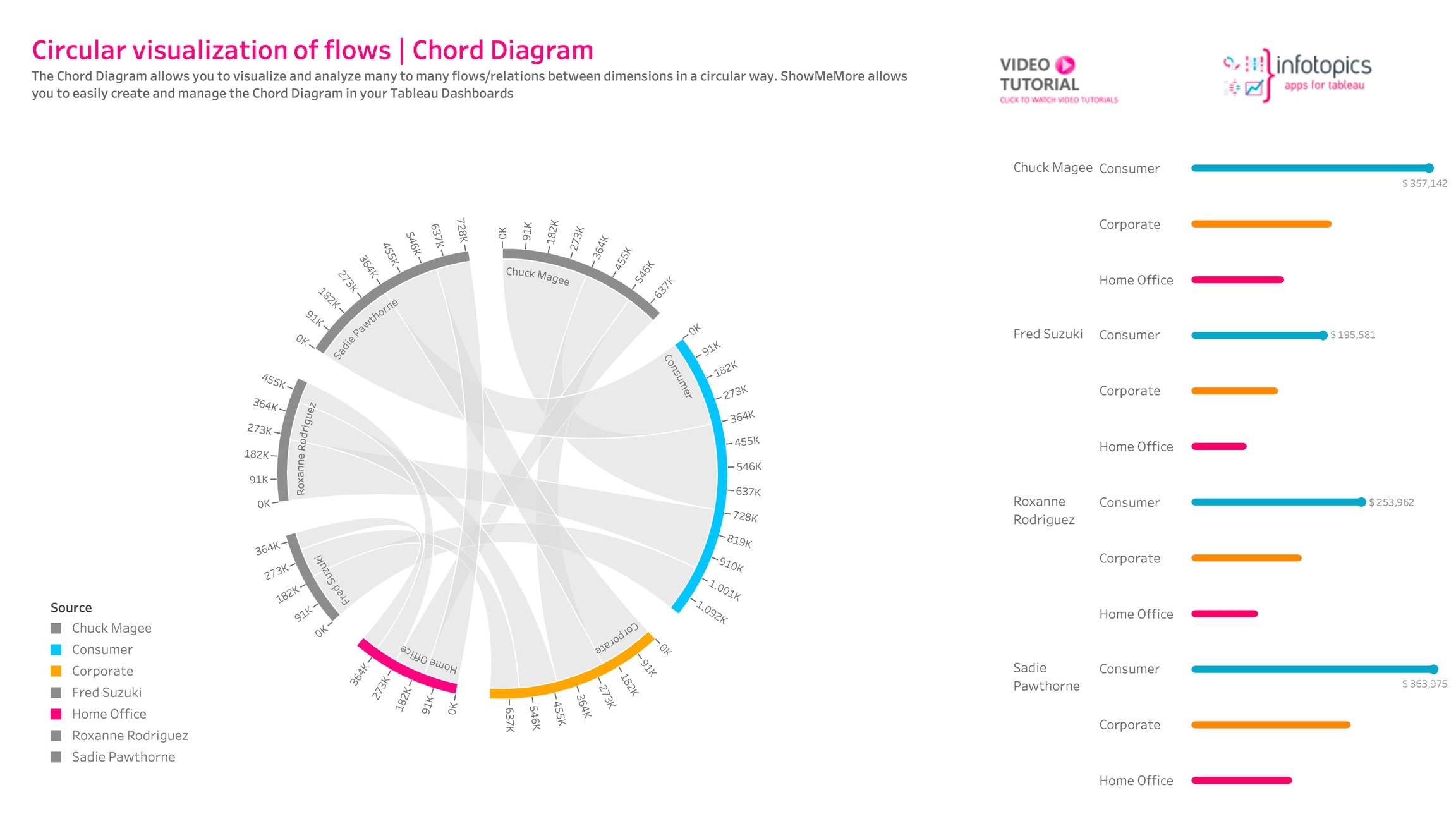 For example, in a company, a chord diagram could show the interactions between regional managers and product categories. Each manager is connected to the categories they oversee, and the sales figures.
