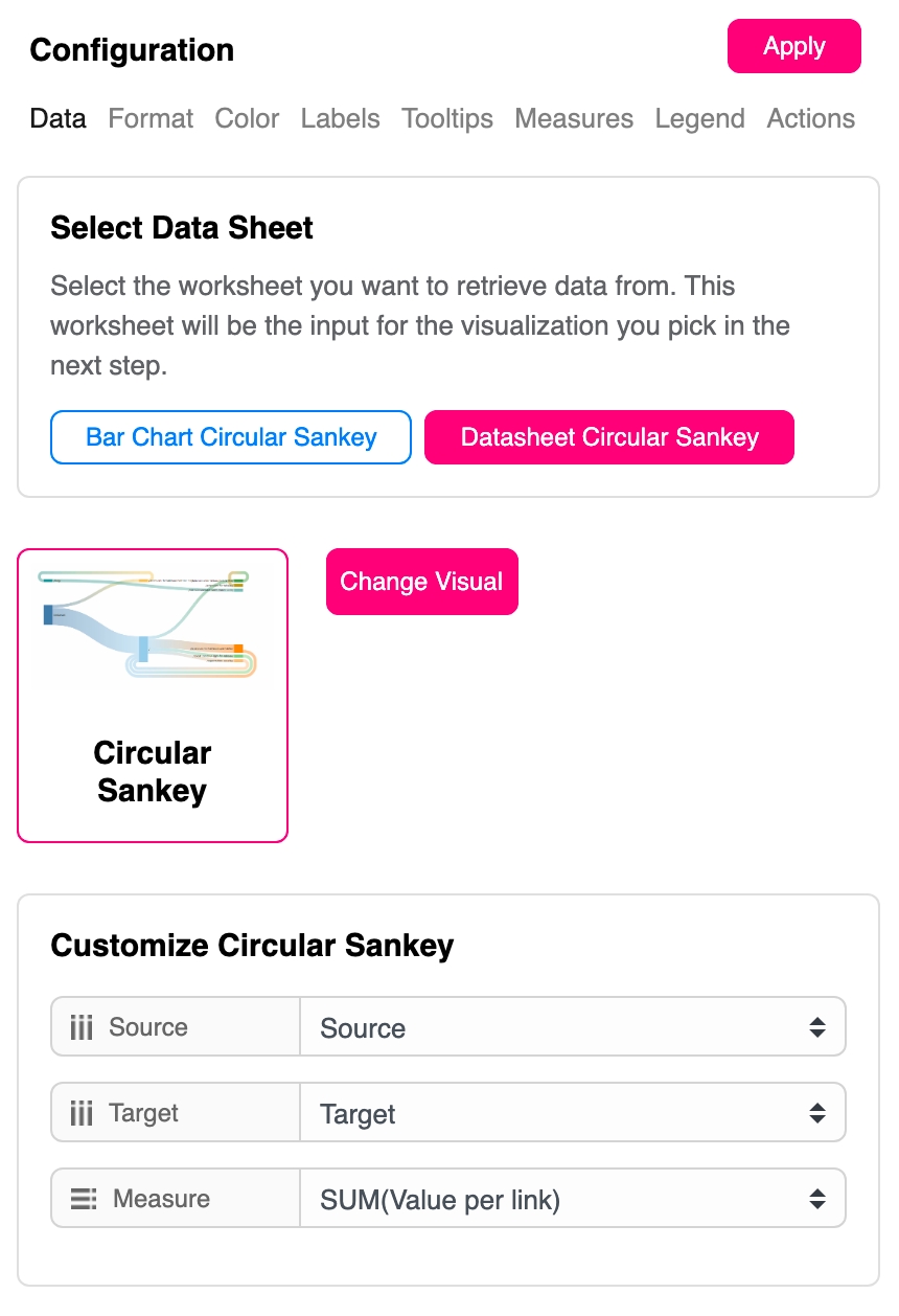 Choose the source and target dimensions from the available options in the datasheet, and select a measure that represents the flow.