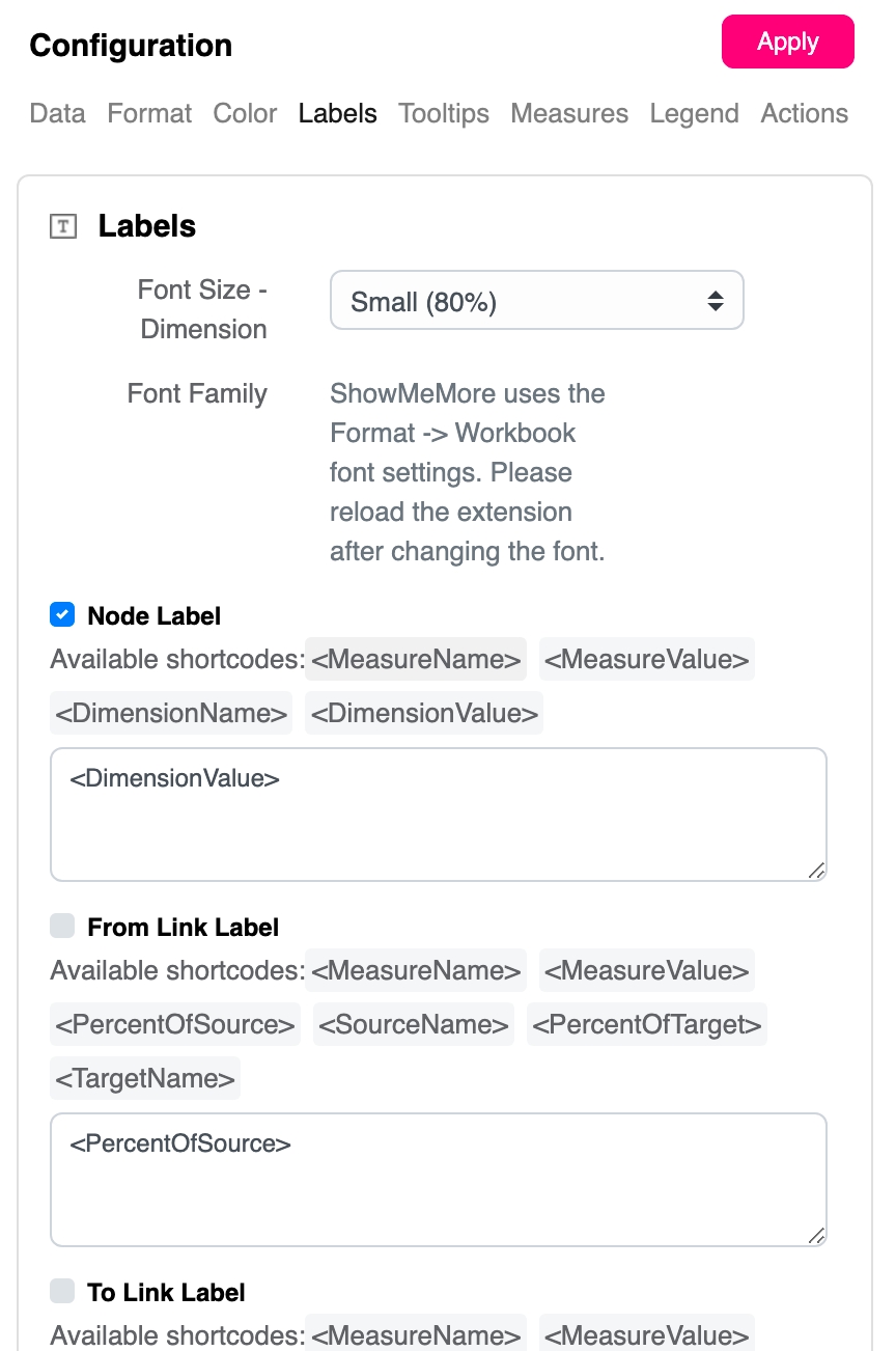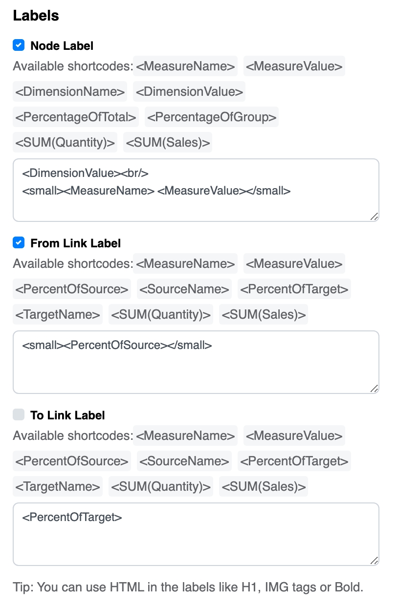 Format the content displayed on your nodes, both going to and coming from them. You can include additional text and utilize shortcodes from your data. You can use HTML such as H1, IMG tags, or Bold for additional formatting options. You can put a word in bold and adjust the text size. You can also add more than one measure to labels or tooltips by including them in the data source.