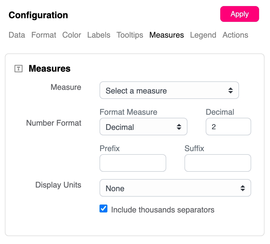 You can format your measure as a decimal or a percentage using the dropdown menu. Input the number of decimal spaces in the 'Decimals' box. You can also add a 'Prefix' and/or a 'Suffix' in the text boxes. The prefix will appear before the word, while the suffix will appear after. For example, a prefix could add a currency symbol like '$' and a suffix could add a percentage symbol '%'. You can also choose to include the thousands separators.