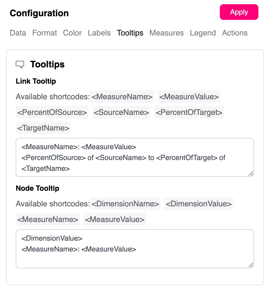 Circular sankey allows users to customize the labels according to their specific needs. The content of these labels can be configured using HTML format, which enables a wide range of customization options. Additionally, users have the convenience of using shortcodes such as <DimensionName> to dynamically insert the dimension name into the labels. This level of flexibility ensures that the labels can be tailored to convey the exact information required, enhancing the readability and effectiveness of the Sankey diagram in representing data flows and relationships.