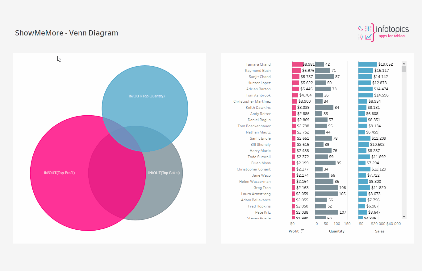 In the example below you can see that selecting a sphere or an overlapping segment of spheres will filter my customers to the ones that are part of the sets involved in my selection.