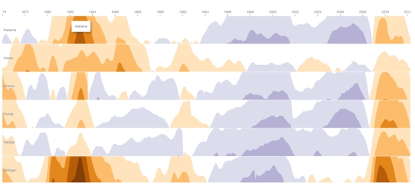 Horizon charts are an alternative to ridgeline plots and small-multiple area charts that allow greater precision for a given vertical space by using colored bands. These charts can also be used with diverging color scales to differentiate positive and negative values.