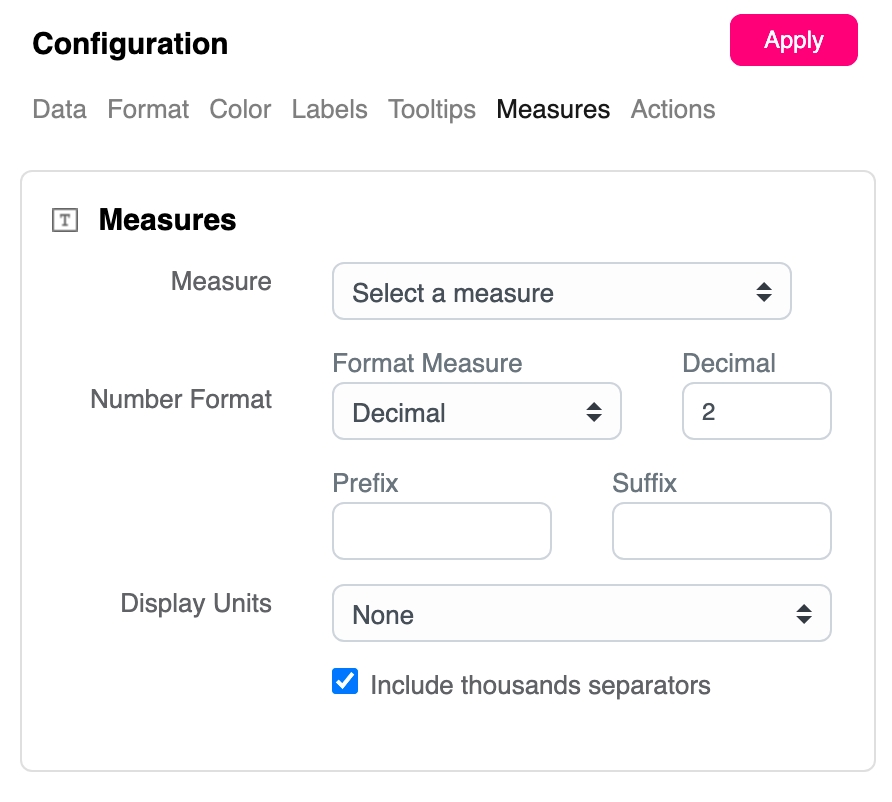 You can format your measure as a decimal or a percentage using the dropdown menu. Input the number of decimal spaces in the 'Decimals' box. You can also add a 'Prefix' and/or a 'Suffix' in the text boxes. The prefix will appear before the word, while the suffix will appear after. For example, a prefix could add a currency symbol like '$' and a suffix could add a percentage symbol '%'. You can also choose to include the thousands separators.