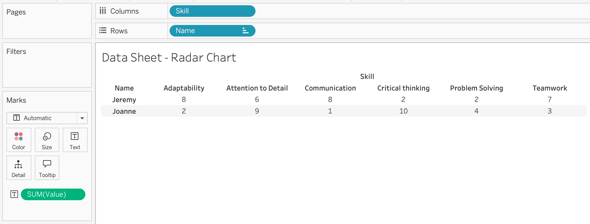 A radar chart represents data with two dimensions and a measure. The spokes of the chart serve as the axes, each representing a characteristic. One dimension is the name of the characteristic, while the measure indicates the value associated with that characteristic. This creates a visual plot in a circular graph where points are connected to display relationships.