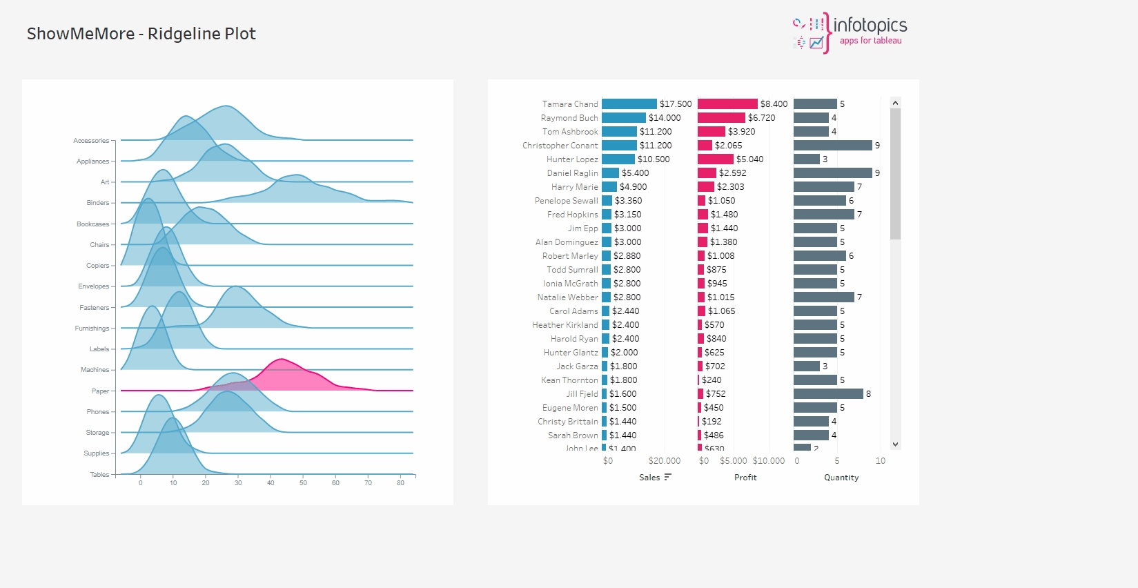 Dashboard actions are available within your Ridgeline Plot! Filter down on a dimension by clicking a node and see that interact instantly with your dashboard. It’s also possible to filter back from your tableau dashboard.