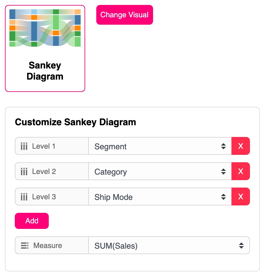You can select different dimensions for each level. Click the "Add" button to add multiple levels to the Sankey diagram. Use the cross button on each level to remove a dimension. The measure is the value displayed on the Sankey diagram.