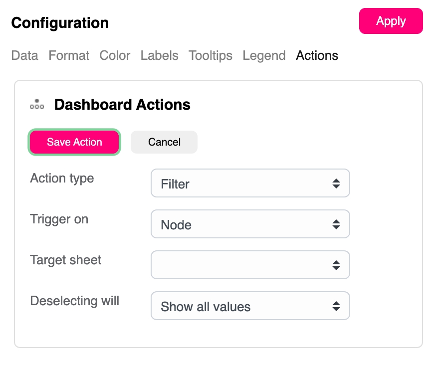 Dashboard actions are available within your Sankey Diagram! Use the ‘New Action’ to begin setting up the dashboard action.